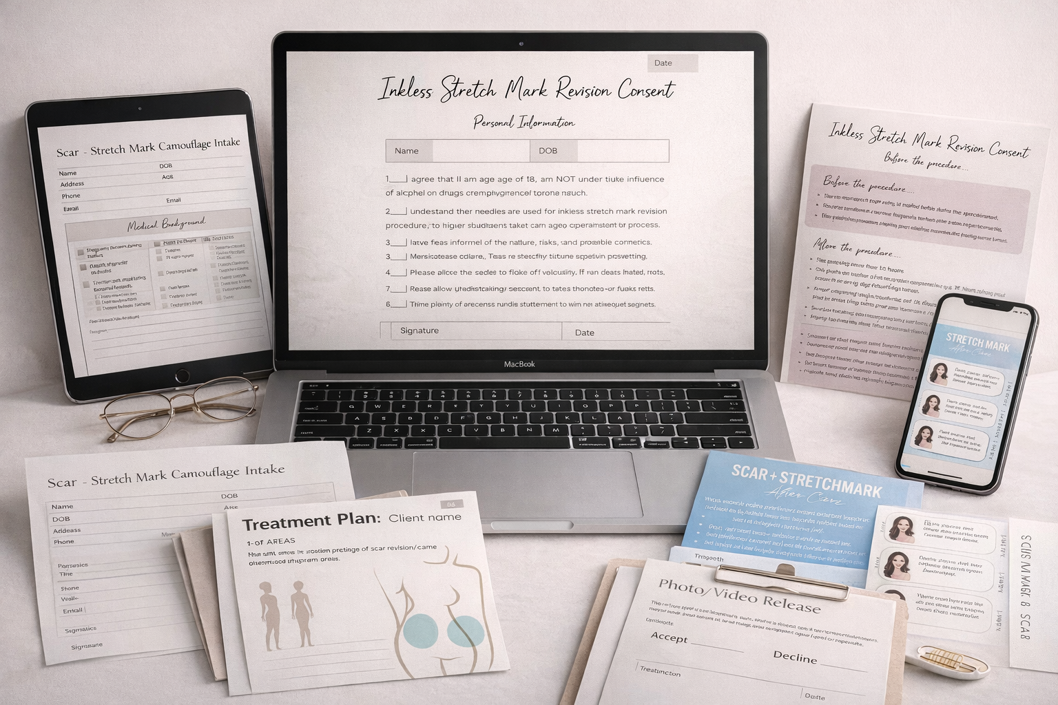 This resource includes a complete intake form, consent form, treatment plan sheet, aftercare cards, photo release form, and pre- and post-care consent document designed for inkless stretch mark revision treatments.