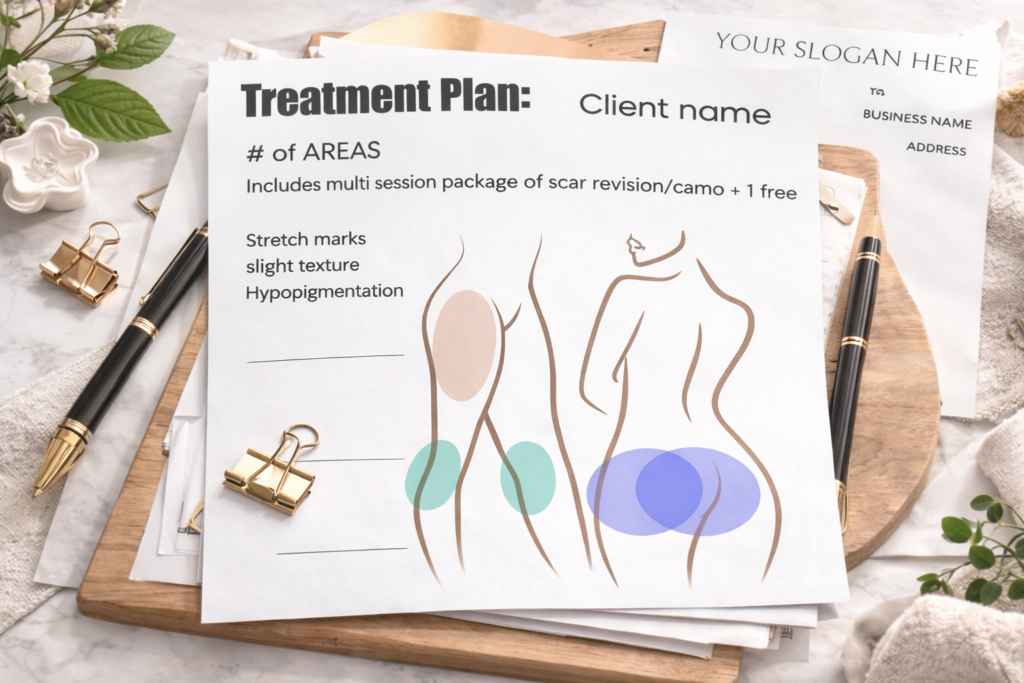 It is a complete documentation workflow designed specifically for paramedical tattoo practitioners performing inkless stretch mark revision and camouflage procedures.